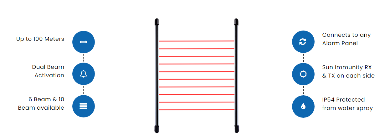 Comprising of 10 active beam lines the strip beam can detect up to 100m apart and uses dual beam trigger detection which means less false alarms than traditional beams.